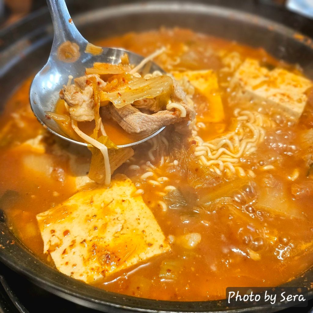 - Korean Food Brief Description: Classic kimchi stew enhanced with chewy ramen noodles,served with golden egg rolls (계란말이)and various fresh banchan.